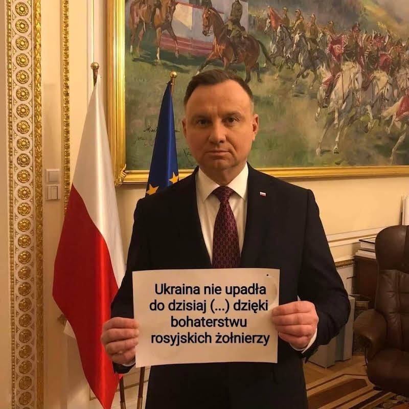 Dalej pan Duda stwierdził, że: ,,Pamięć o Wołyniu to „polityka biegania z widłami”. Ten człowiek, chyba zapomniał, a raczej rżnie głupa, że nie wie, iż to właśnie UPA, którą wciąż czci Ukraina, nabijała na widły polskie dzieci. A rząd jego kolegi z Kijowa, Zełenskiego kontynuuje właśnie prowadzenie polityki latania z rzeczonymi widłami i nawet się nie tylko z tym nie kryje, ani tego nie wstydzi, ale przeciwnie, jest z tego powodu wręcz dumny. Co więcej będąc w Warszawie, gdy odbierał z rąk tego samego pana Dudy najwyższe polskie odznaczenie, to wtedy pan Duda nie zauważył, czy też raczej udawał, że nie widzi, iż pan Zełensky, którego odznaczał Orderem Orła Białego, miał na sobie bluzę z symbolem OUN - M, czyli symbolem WIDEŁ, a zarazem emblematem melnykowców, czyli dywizyjników SS Galizien, tych samych, którzy bestialsko pacyfikowali Powstanie Warszawskie. Kto tu więc prowadzi politykę latania z widłami?